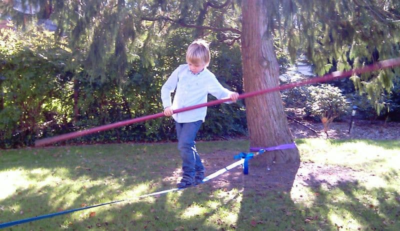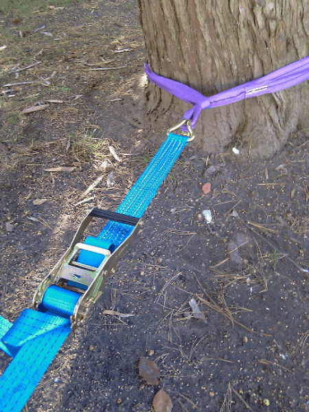 Rundschlinen um die beiden Bäume legen und mit dem Spanngurt verbinden. Spanngurt spannen.