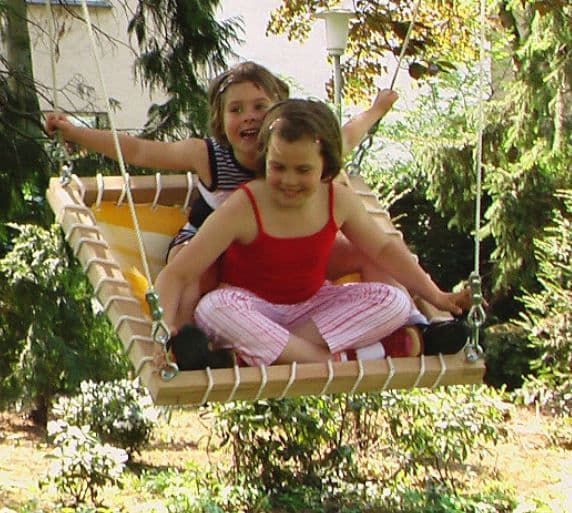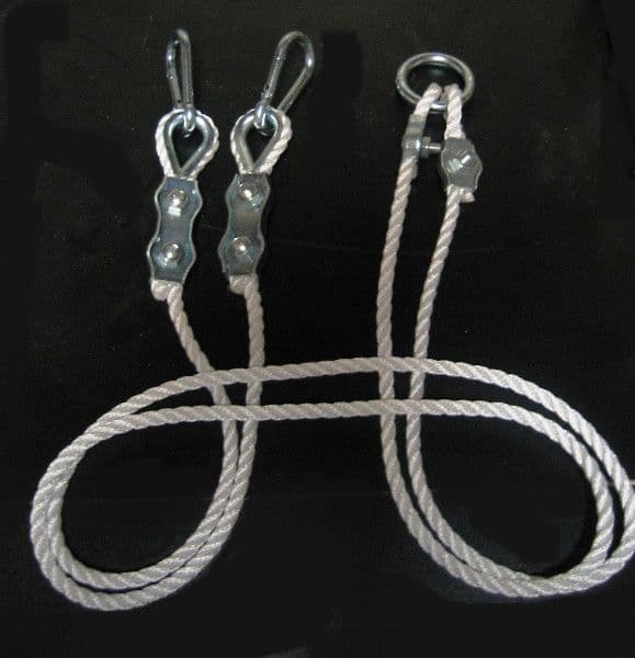 Cut off two 1.5 metre lengths of rope. Place a rope thimble at the beginning of each rope and fasten with a duplex clamp. Place a loop at the end of each rope and insert the swing ring, secure with a simplex clamp. Pull the snap hook through the rope thimble.