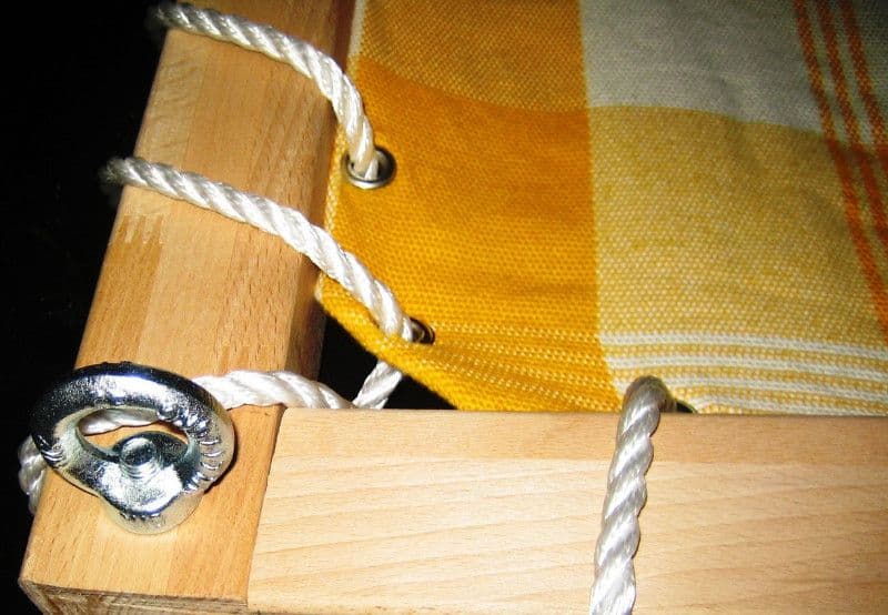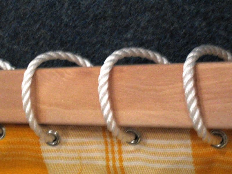 Attach the eyelets to the fabric and fix it to the frame with the rope.